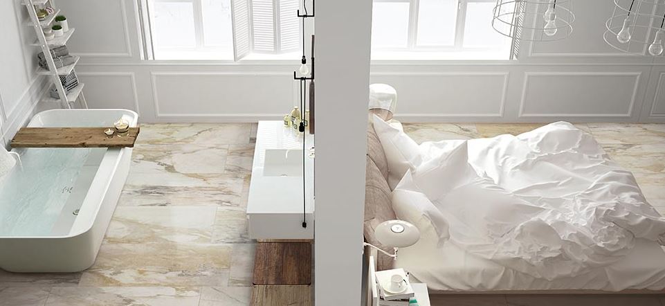 Fliesen aus Feinsteinzeug in Natursteinoptik Marmor.
